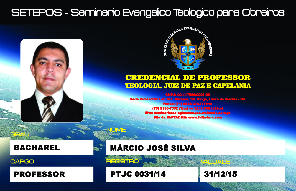 desta forma será uma grande festividade e uma grande vitoria para o Pastor José Carlos Marques dos Santos Bacharel em Teologia que nos seus 4 Anos e Meio de Estudos foiConcluido com 48 Materias e foi Abençoado por Deus e pelo Senhor Jesus Cristo e pelo grande desempenho e paciência com o que os professoures e Munitores tiveram para com o nosso Diplomado se empenhando e com afinco dedicou-se em estar monitorando e prestando todo o apoio Nessecario, nos da Convenção te parabenizamos Pastor José Carlos Marques dos Santos, pela a seu Frmatura e que o senhor Deus esteja sempre na tua Vida.